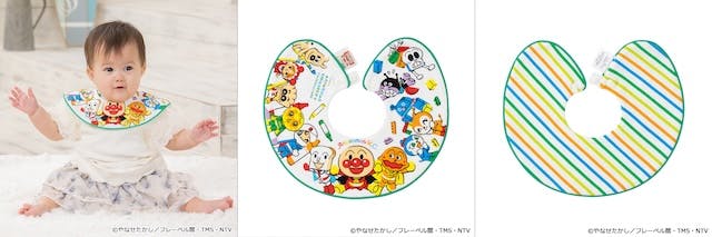 アンパンマンの仲間たちが可愛らしくデザインされたスタイです。丸い形がよだれをしっかりキャッチし、広い範囲をカバーしてくれます。サイズ調整が可能なので、長く使えるのが嬉しいポイント。裏面はシンプルなストライプ柄のリバーシブルデザインで、その日の気分や服装に合わせて楽しめます。カラーはオフ白、サイズはFREE。価格は2,090円(税込)です。