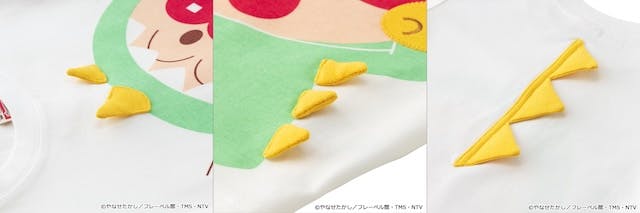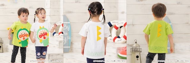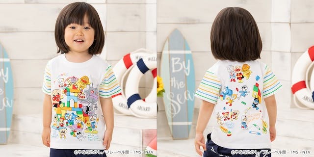 ミュージアムの大人気ステージ『イッツ!しらたまショータイム!』に登場するアンパンマンが大きくデザインされた半袖Tシャツです。手や角はアップリケで立体的になっていて、後ろには背びれのギザギザが別布で付いた、なりきり風のデザインが楽しい一枚。カラーはオフ白とライムの2色、サイズは80cmから120cmまで展開。価格は4,290円(税込)です。