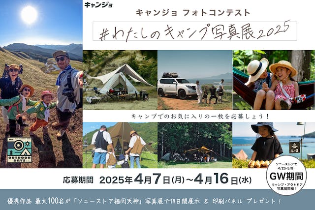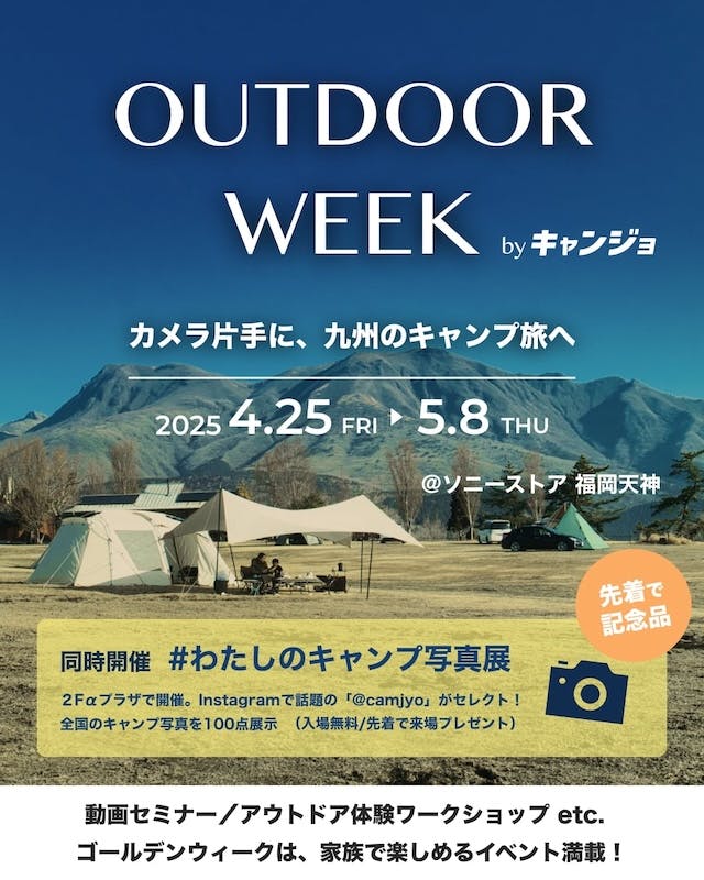 「OUTDOOR WEEK OPENING PARTY」は、キャンプ女子株式会社とソニーストア 福岡天神が主催する「OUTDOOR WEEK by キャンジョ」の開催を記念して行われます。同日からは、全国から選ばれた優秀作品100点が展示される「#わたしのキャンプ写真展2025」(4月25日〜5月8日)もソニーストア 福岡天神のαギャラリーにて同時開催されます。さらに、映像作品を公募する「九州アウトドアムービーコンテスト」も同日にスタートするなど、盛りだくさんの内容となっています。