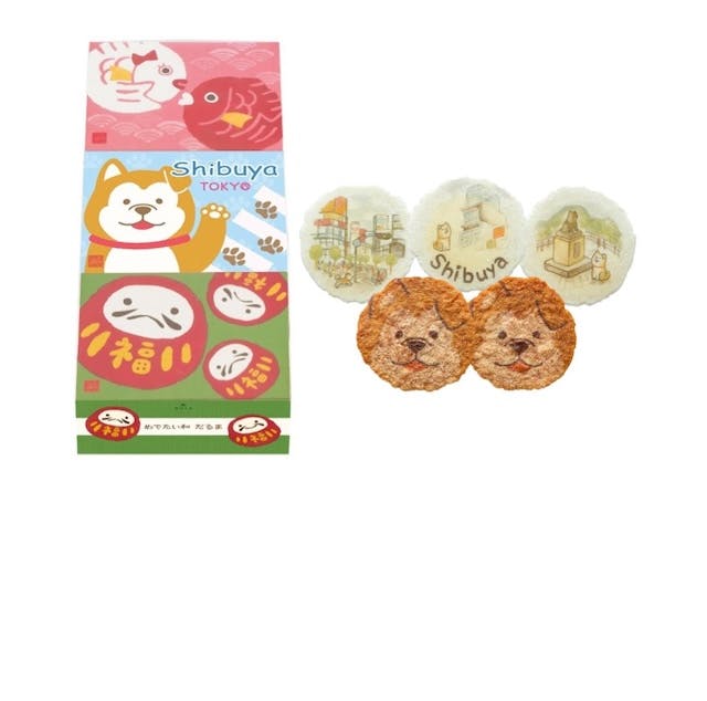 縁起物の紅白鯛とだるまを描いたえびせんべい、そして東横のれん街限定の「渋谷えびせんべい」の詰め合わせ。限定の掛け紙には、可愛らしいわんこが描かれており、手土産に最適です。