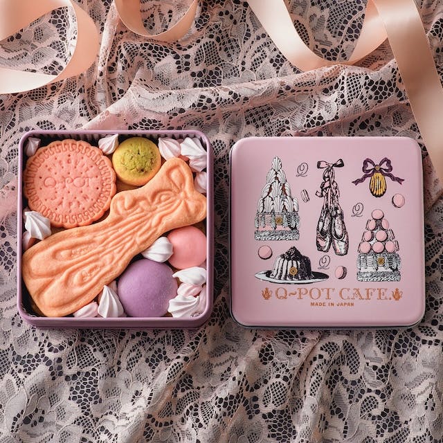 宝石のように美しい焼き菓子を贅沢に詰め合わせたQ-pot CAFE.の「プティ フール セック」。今回は、バレリーナが憧れる「トウシューズ」のクッキーが主役です。華やかな舞台で舞うバレリーナのように優美に仕上げられています。ブルーベリーとフランボワーズのマカロン、ピスタチオクッキー、ホイップクリームメレンゲ、ストロベリーミルククッキーも添えられています。販売期間は4月24日(木)~30日(水)、販売場所は地下2階 フードステージB2です。