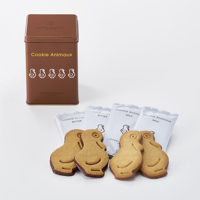 チャーミングなアヒルをモチーフにした人気のクッキー。キャラメルを混ぜ込んで香ばしく焼き上げ、ビターチョコレートでコーティングした「ビター」と、バタークッキーをまろやかなミルクチョコレートでコーティングした「ミルク」の2種類が楽しめます。