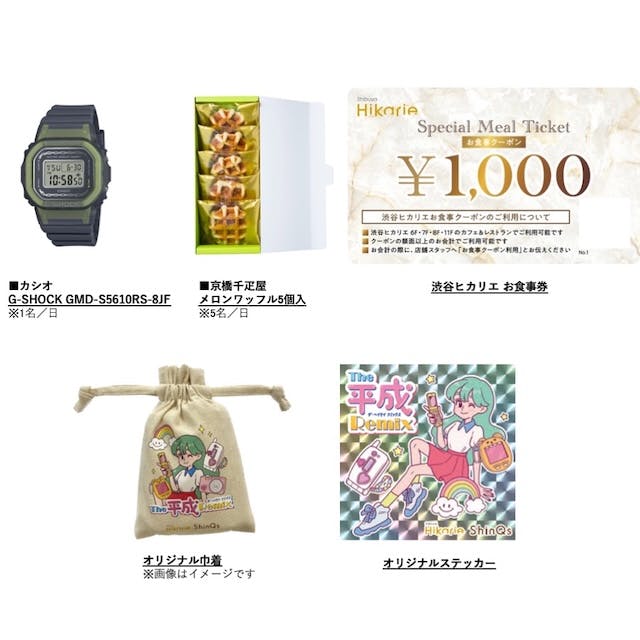 渋谷ヒカリエ ShinQs 地下3階~5階、または渋谷ヒカリエ 6階〜11階のカフェ&レストランで、一会計3,000円以上のお買い上げで、平成をモチーフにしたオリジナルグッズや渋谷ヒカリエで利用できるお食事券などが当たる抽選会に参加できます。開催期間は5月1日(木)〜6日(火・休)で、2階 上りエスカレーター前 特設スペースが会場です。お食事やお買い物を楽しんだ後は、ぜひ抽選会にチャレンジしてみてください!