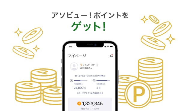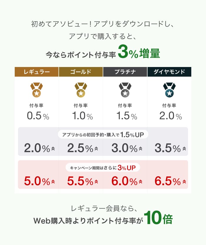 アソビュー!アプリで予約・購入するだけで、会員ステージごとに付与されるポイントよりポイント付与率が+3%アップ!