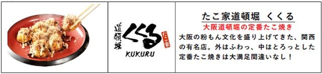 - たこ家道頓堀くくる: 大阪道頓堀の定番たこ焼き。とろっとろの食感がたまらない!