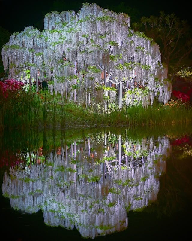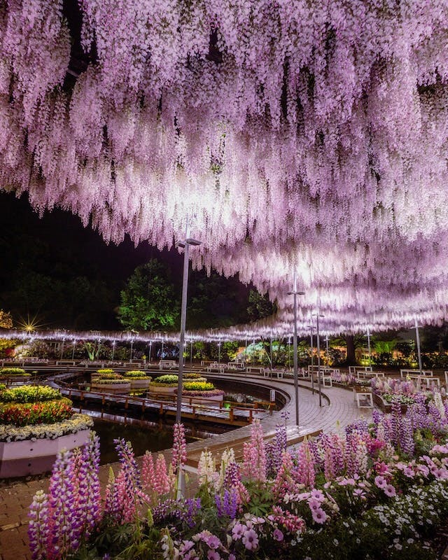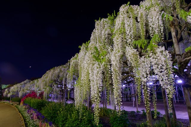 「ふじのはな物語」では、うす紅藤、大藤、八重黒龍藤、白藤、きばな藤と、様々な種類の藤の花を楽しめます。 それぞれの藤が見頃を迎える時期が少しずつ異なるため、期間中は様々な藤の花の表情を楽しめるのが魅力です。 昼間の華やかな姿はもちろん、ライトアップされた幻想的な夜の藤も必見!