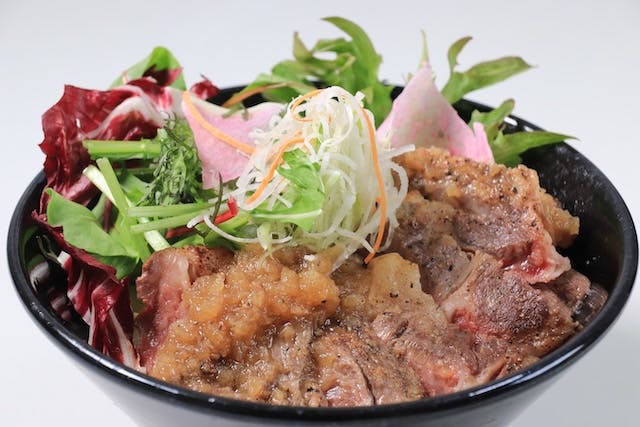 栃木の大自然の中で健やかに育ったブランド牛「下野牛」を使った「下野牛のステーキ丼(みそ汁・香の物付)」。