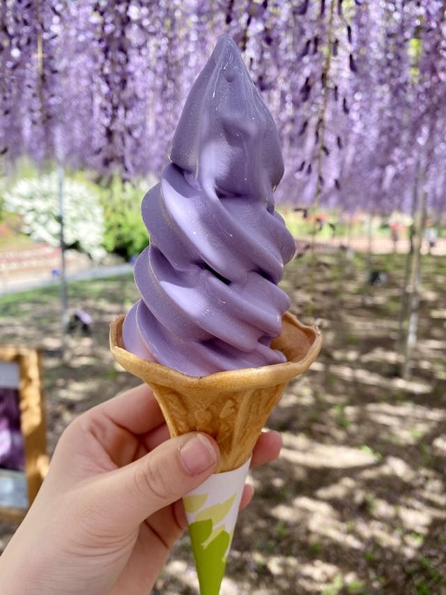 あしかがフラワーパークで大人気! 藤の香りが上品な「藤ソフト」は、外せない定番スイーツ。