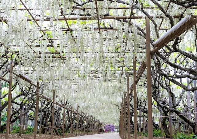 長さ80mにも及ぶ「白藤のトンネル」。 白く清らかな藤の花が、頭上を覆う幻想的な空間です。