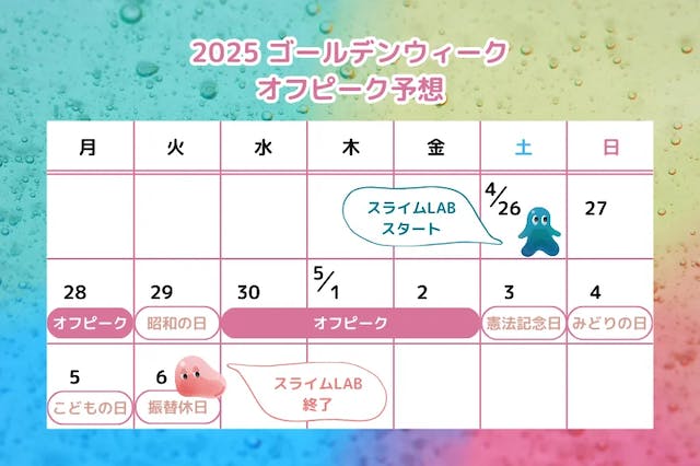 「スライムLAB リターンズ」は、GW期間中の4月26日(土)~5月6日(火・祝)の11日間、毎日開催! 比較的空いているのは、平日の4月28日(月)、30日(水)、5月1日(木)、2日(金) と予想されています。