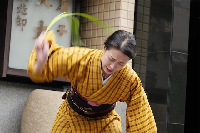 今回のイベントは、大西女将と一緒に「菖蒲打ち」を体験できる貴重なチャンス!各会場では、女将による解説や実演を見た後、実際に「菖蒲打ち」に挑戦できます。女将が力強く菖蒲を叩きつける様子は、撮影してSNSにアップしてもOK!体験後には、お土産として「いけずコースター5枚セット」がもらえます。