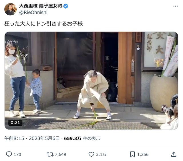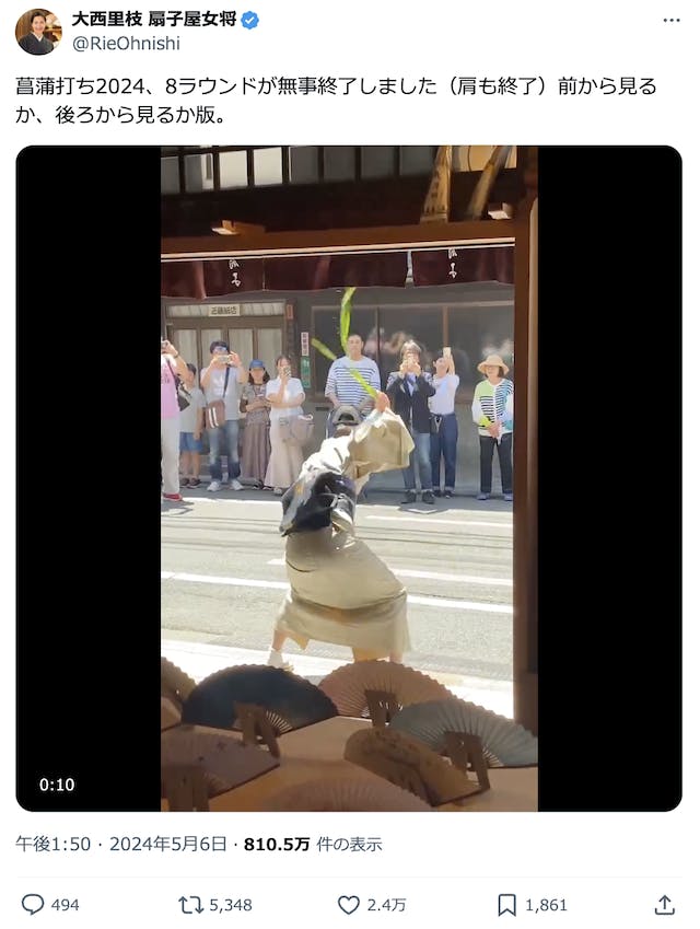 京扇子屋の女将・大西里枝さんは、以前からSNSやイベントを通じて「菖蒲打ち」の魅力を発信してきました。2023年にはX(旧Twitter)での投稿が659万回表示、翌年には810万回表示されるなど、その活動は大きな注目を集めています。