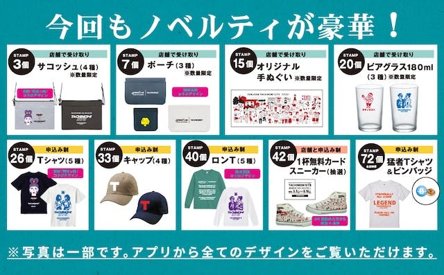 - スタンプ72個:猛者Tシャツ&ピンバッジ