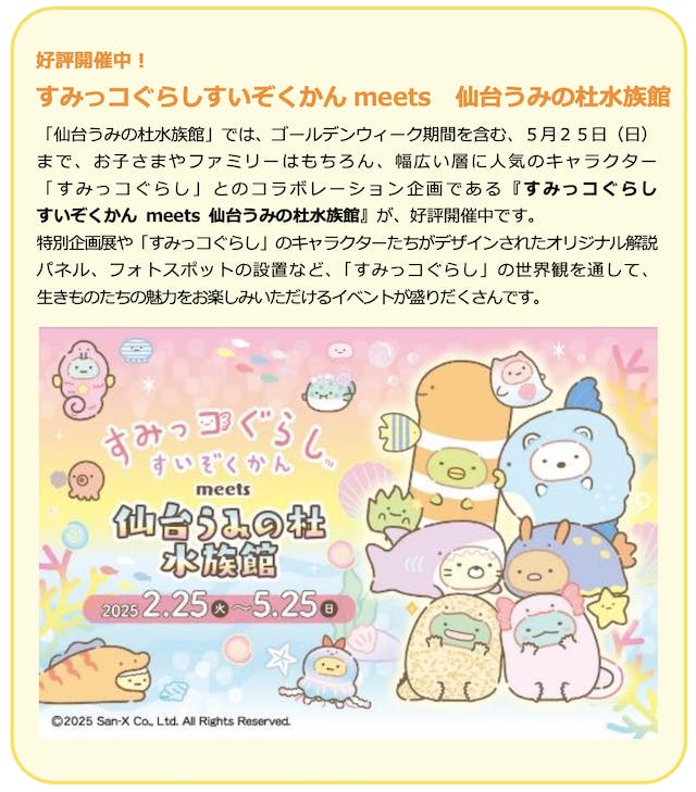 5月25日まで、大人気キャラクター「すみっコぐらし」とのコラボレーション企画『すみっコぐらしすいぞくかん meets 仙台うみの杜水族館』も開催中!