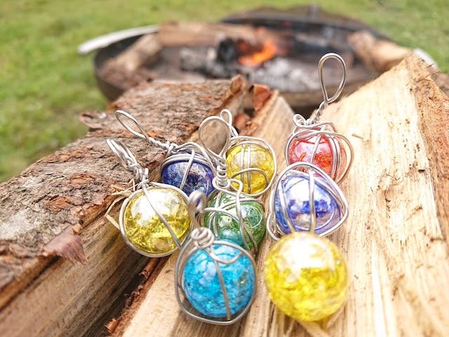 - 炭で焼いたクラッシュビー玉のキーホルダー作り:独特の風合いが楽しめる手作りキーホルダー
