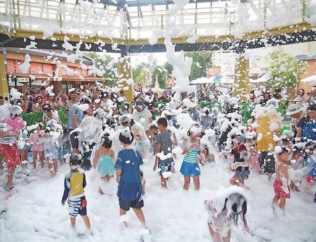 オアシスパークでは、大量のもこもこ泡が降ってくる「清流・泡かけまつり」が開催! 泡まみれになって、子供も大人も大はしゃぎ!春の思い出作りにぴったりです。