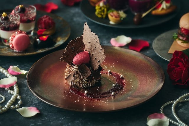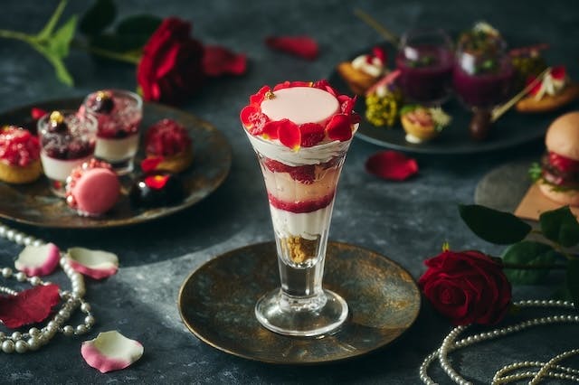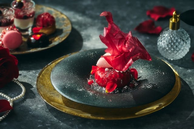 「Sweets Jewelry Garden ~チェリー&ローズ~」では、誕生石をイメージしたウェルカムドリンクから始まり、宝石のように美しい食材とローズの香りが織りなす、特別なマリアージュを堪能できます。
