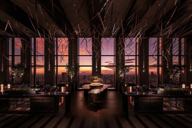 2025年3月27日(木)に開業した「TAKANAWA GATEWAY CITY」が見据える未来への輝きと呼応するように、地上130mの高さから変わりゆく高輪・品川の街並みを一望できます。チェリーとローズのハーモニーに包まれ、まるでドレスアップしたかのような、心華やぐ食体験を堪能してください。