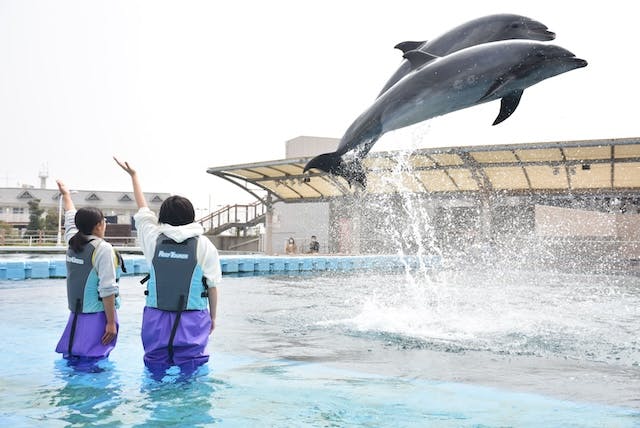 水族館「ふれあいラグーン」では、ドルフィントレーナーを目指すプログラム「イルカとあそぼう」を実施。 長靴を着用してプールに入り、イルカの健康チェックやトレーニングを学び、ごはんをあげたり、触れ合ったりできます。 イルカとの特別な体験を通して、ドルフィントレーナーを目指しましょう!