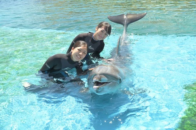 ふれあいラグーンでは、バンドウイルカと一緒に泳げるプログラムも! ウェットスーツを着てプールに入り、イルカと目を合わせたり、触れ合ったり、一緒に泳いだりできる貴重な体験です。 イルカの魅力を満喫できる、GWの思い出にぴったりのプログラムです。
