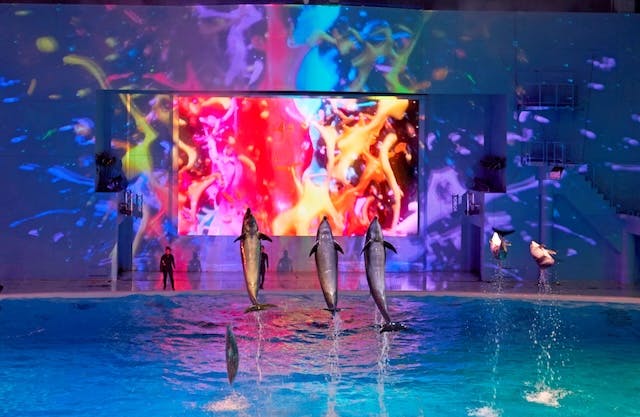 水族館「アクアミュージアム」4階 ライブスタジアムでは、噴水や照明などの演出と、トレーナーと生きものたちによるパフォーマンスを披露。イルカのダイナミックなジャンプや、シロイルカの優雅な水中パフォーマンスなど、生きものたちの能力や魅力を体感できます。