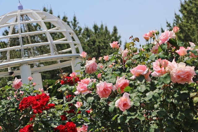 八景島内の丘の広場「バラ園」では、5月に約100種500株のバラが咲き誇ります。 海に囲まれた景色の中で、美しいバラを鑑賞できます。