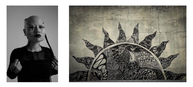 2005年生まれのGURIRONさんは、沖縄のツルやヘゴの植物といった、南国特有の植生に着目。植物の持つ繊細な造形や有機的なシルエット、独特な質感からインスピレーションを得て、それらを模様として再構築し、壁画やキャンバス、人体に描き出すアーティストです。植物が内包する弱さと力強い生命力という二面性に着目し、人工物と自然のせめぎ合いの中で生き抜く草の姿を力強く繊細な模様で表現しています。また、ボディーペイント作品では、人間の皮膚をキャンバスと捉え、街の風景や人物の雰囲気と融合させ、生きることの美しさや儚さを可視化しています。