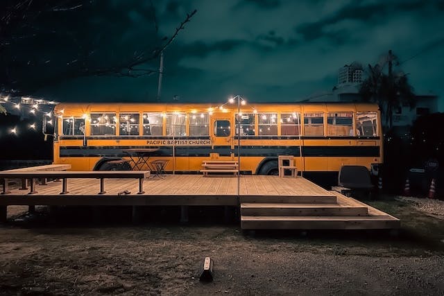 沖縄県北谷にある、アメリカからやってきた黄色いスクールバスを改装した古書店。沖縄本や絵本、洋書を中心にセレクトし、車内で本とじっくり向き合ったり、セルフ喫茶と共にゆんたくを楽しんだりできる、ゆったりとした空間です。