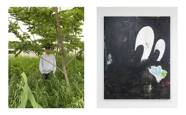 東京生まれのKINJOさんは、沖縄にルーツを持ち、日本と関わりの深いアメリカ文化を題材にした絵画や立体、パフォーマンスを発表しています。独自の記号を繰り返し描いては消す作業の中で生まれる曖昧なイメージが、作家自身のポートレイトのように「個人的な存在」へと変容する作品は、自身のルーツを掘り下げる行為でもあります。
