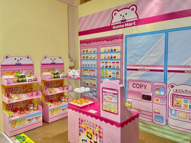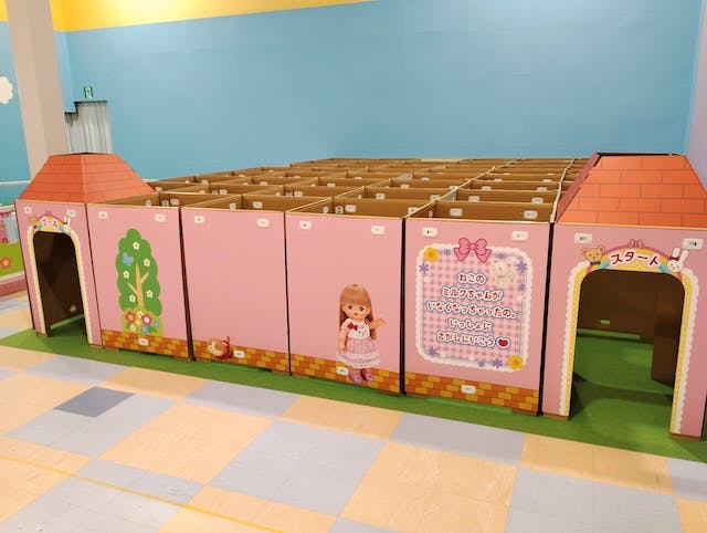 メルちゃんのおもちゃと同じお店やおうちを再現したプレイコーナーで、メルちゃんの世界で遊ぶことができます。ダンボール製のくまさんカーに乗ってドライブを楽しむこともできます。