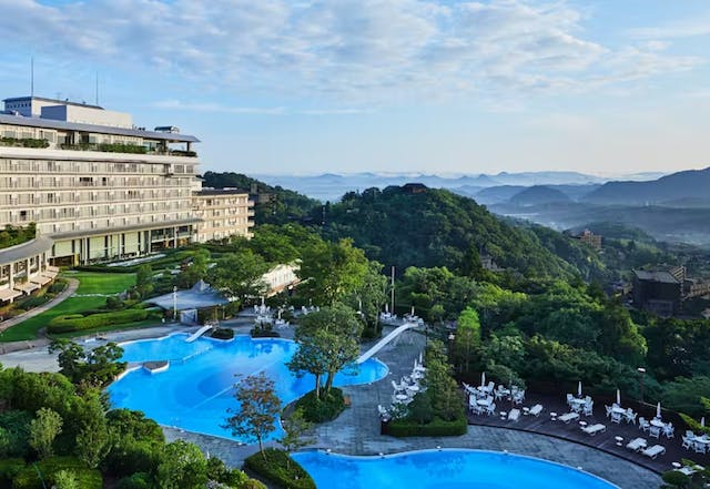 日本三名泉のひとつ、有馬温泉の高台に立つ「有馬グランドホテル」。その中にある「アクアテラス」は、水着で楽しめる温泉と屋外温水プールが融合したリラクゼーション施設です。有馬の自然を眺めながら、ゆったりと温かいプールに身を委ねる時間は格別。日帰りプランもあるので、気軽に立ち寄れるのも嬉しいポイントです。