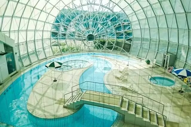 ガラスドームが特徴的なウォーターガーデンのある温泉施設です。流れるプールや子どもプール、2つのジャグジーがあります。