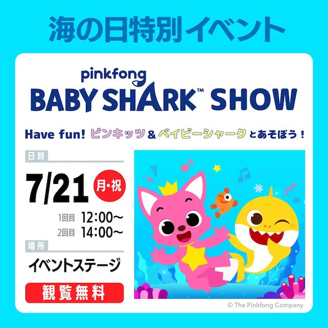 7月21日には「Have fun! ピンキッツ&ベイビーシャークとあそぼう!」が開催されます!子どもたちに大人気のあの曲に合わせて、一緒に歌って踊って盛り上がりましょう。家族みんなで楽しめる、笑顔あふれるステージイベントです。