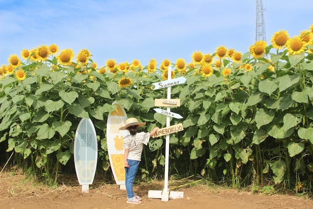 今年のテーマ「ひまわりの海」にちなみ、ビーチをイメージしたボートやパラソル、サーフボードパネルなどのフォトスポットが用意されています。牧場ならではのユニークな写真撮影が楽しめます。