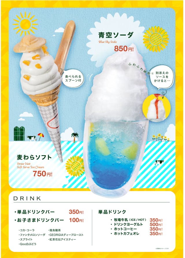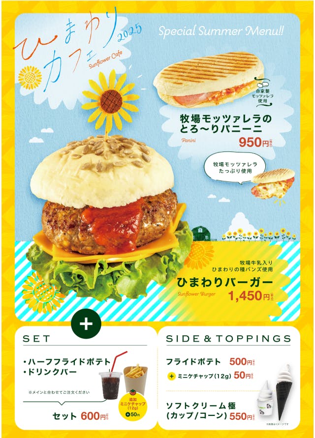 「YUMEBOKU SUMMER FESTIVAL 2025」では、見た目も可愛い夏限定メニューが登場します。牛乳入りのバンズを使った「ひまわりバーガー」や、麦わら帽子モナカが乗ったソフトクリーム、爽やかな「青空ソーダ」など、夏らしい特別な味をぜひお楽しみください。