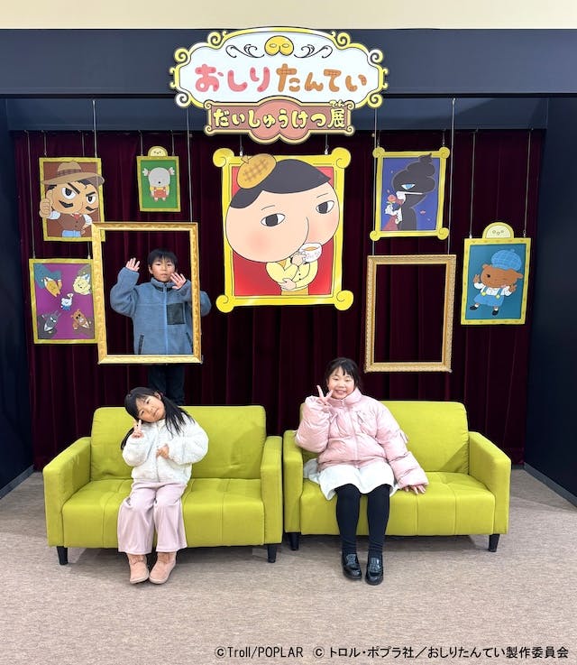 おしりたんていや仲間たちになりきれる「なりきりフォトブース」では、作品の世界に入り込んだような気分で記念撮影が楽しめます。フレームに入ったり、特製のソファに座ったりして、ここだけの思い出の一枚を撮りましょう!