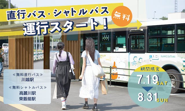 川越駅⇔メッツァ間の無料直行バス(要予約)と、高麗川駅・東飯能駅⇔メッツァ間の無料シャトルバスが毎日運行しています。