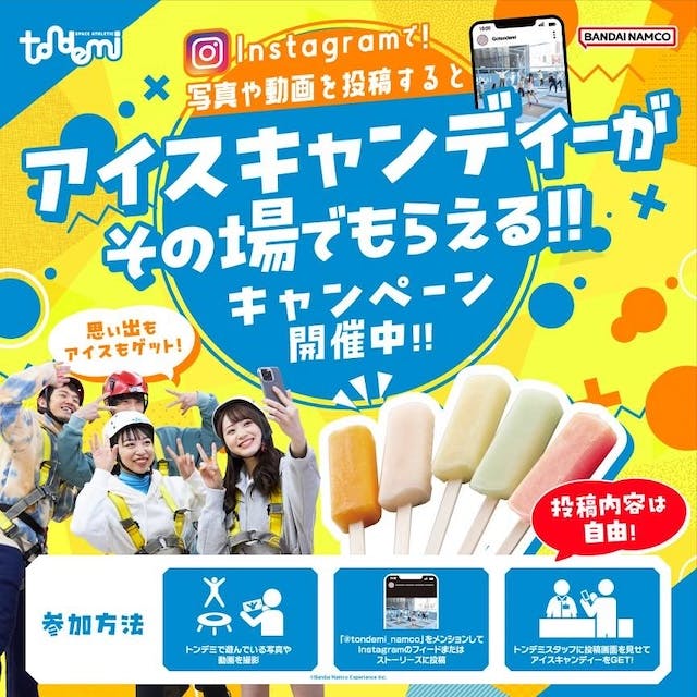 トンデミで遊んだ写真や動画を、指定のハッシュタグをつけてInstagramに投稿すると、もれなく「アイスキャンディー」をプレゼント!遊びの思い出を写真に残して、おいしいご褒美もゲットしましょう!