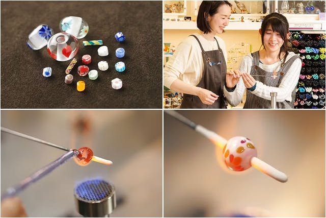 館内には、世界中から集められた古代から現代までのガラス工芸作品が約2,000点展示されています。デモ・体験工房では、実際にとんぼ玉を作れる制作体験が開催されています。