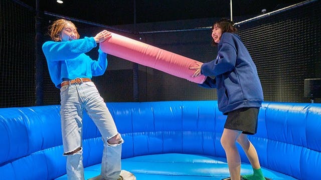 ふわふわの大きな棒で相手を押し合う“押し相撲”。単純ルールなのに白熱!親子対決やカップル対決など、誰とやっても盛り上がります。