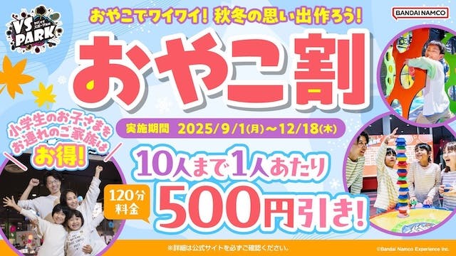2025年9月1日(月)〜12月18日(木)の期間、VS PARKでは「おやこ割」を実施します。小学生のお子さまと大人が一緒に来場すると、120分料金がお一人あたり500円引きに。家族はもちろん、親戚やお友だち家族とのおでかけにもぴったり。秋冬は屋内で思いきり遊んで、みんなで思い出づくりを楽しみましょう。