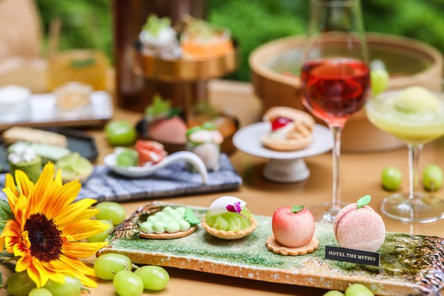 HOTEL THE MITSUI KYOTOでは、旬のシャインマスカットと桃を使ったアフタヌーンティーが楽しめます。特に目を引くのは、桃の形をしたムースや、シャインマスカットのタルトレット。美しいスイーツの数々は、見た目にも楽しませてくれます。優雅な庭園を眺めながら、友人や家族と共に特別な時間を過ごすのにふさわしい場所です。オリジナルモクテルと共に、心温まるひとときをぜひお楽しみください。