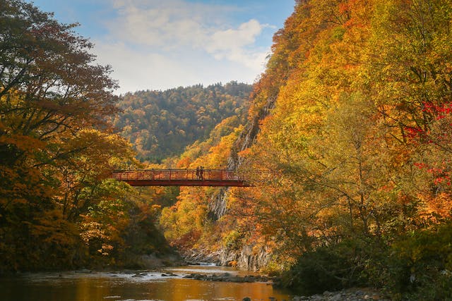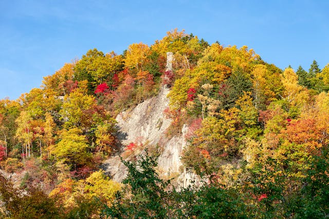 定山渓ダム下流園地では、10月上旬から中旬にかけて、紅葉が見頃を迎えます。カエデやカツラの美しい色づきは、まさに圧巻。園地内には散策路も整備されており、ゆっくりと自然を楽しむことができます。ダム湖であるさっぽろ湖を眺めながら、心落ち着くひとときをお過ごしください。友人や家族との紅葉狩りにぴったりの場所です。