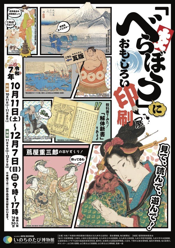北九州市立自然史・歴史博物館(いのちのたび博物館)では、秋の特別展「「べらぼう」におもしろい印刷展」が開催されています。 私たちが日常的に触れている「印刷」が、どのように発展してきたのか、その歴史と魅力を探る興味深い展覧会です。特に江戸時代には、印刷技術の発展が出版業を確立させ、学問や娯楽といった豊かな文化を花開かせる基盤となりました。 先人たちの工夫と技術の進化を、ぜひこの機会にご覧になってみませんか?「べらぼう」に面白い発見が待っているかもしれません。
