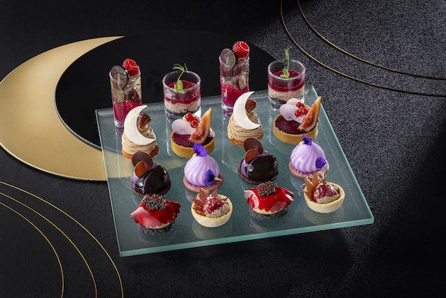 コンラッド東京で楽しめる「ハロウィンアフタヌーンティー “グレイスフル・ムーン”」は、秋の夜長にぴったりな特別メニューです。月夜をテーマにしたスイーツやセイボリーが並ぶプレートは、見た目にも華やかで、手作りのこだわりが詰まっています。ワインレッドや黒、紫の色彩が印象的で、味わいだけでなく視覚でも楽しませてくれる一品です。大切な人との特別な時間を過ごすのに最適な場所で、ロマンチックなひとときを演出します。
