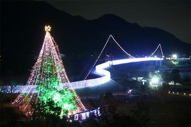 宮ヶ瀬の冬の風物詩として親しまれる「宮ヶ瀬クリスマスみんなのつどい」。高さ30mを超える自生のもみの木が、ジャンボクリスマスツリーとして約1万球の電飾で彩られます。また、水の郷大吊り橋や水の郷商店街もイルミネーションで飾られ、温かい光に包まれながら散策を楽しめるのがポイント。湖畔の静かな夜に輝く巨大なツリーは、一見の価値ありです。