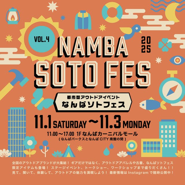 都市型アウトドアフェス「なんばソトフェス」が今年も開催!全国のアウトドアブランドが集結し「ファッション」「食」「ワークショップ」、そしてショッピングまで楽しめます。最新ギアや見逃せないブースなどをテーマに、イベントの楽しみ方を紹介するステージイベントが行われるのもポイント。友達や家族と一緒にアウトドアの魅力を体験できる絶好の機会です。