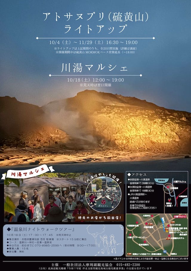 硫黄山では、秋の夜を美しく彩るライトアップイベントが開催されています。幻想的な山肌に立ち上る噴煙が、夜空に映える光景はまさに圧巻です。ライトアップされた硫黄山を見ながらの「温泉川ナイトウォークツアー」も実施されており、温泉の香りを感じながらの散歩は、心身ともにリフレッシュできること間違いなし。友人やカップルでの参加にもおすすめで、記念に残る素敵な時間を過ごせることでしょう。ぜひ、この機会に秋の川湯温泉を訪れて、特別な体験を楽しんでみてはいかがでしょうか。