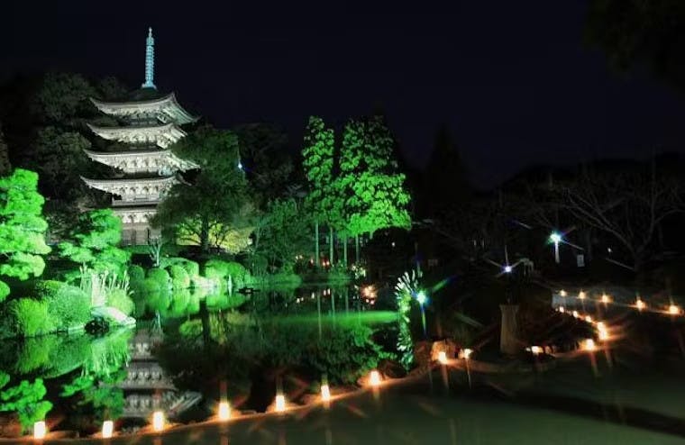 「山口ゆらめき回廊」は、山口市の香山公園で開催されるイルミネーションイベントです。国宝瑠璃光寺五重塔や散策路が幻想的な光で包まれ、訪れる人々を魅了。キャンドルライトを主役にした光の演出が施され、特に夜の時間帯にはその美しさが際立ちます。歴史を感じながら過ごす夜のひとときは、街中のイルミネーションとはまた違った趣でいっぱい!美しい光の中で、素敵な思い出を作ってみませんか?