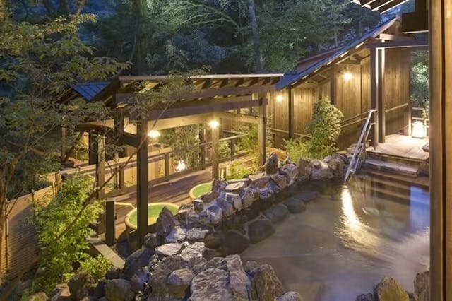 箱根湯寮は、箱根湯本駅から無料送迎バスで約3分の場所にある、「古民家風の里山温泉」をコンセプトにした日帰り温泉施設です。首都圏最大級の19室の貸切個室露天風呂を備え、プライベートな空間で源泉かけ流しの温泉を満喫できます。大浴場には内湯と露天風呂があり、アルカリ性単純温泉の柔らかな湯質が特徴。施設内のお食事処「囲炉裏茶寮 八里」では、囲炉裏を囲んで炉端焼きや季節の料理を楽しめます。また、ロウリュウサービス付きのフィンランドサウナも完備。古民家の温かみある雰囲気の中、貸切風呂でゆったり過ごしたいカップルや家族連れに人気の温泉施設です。